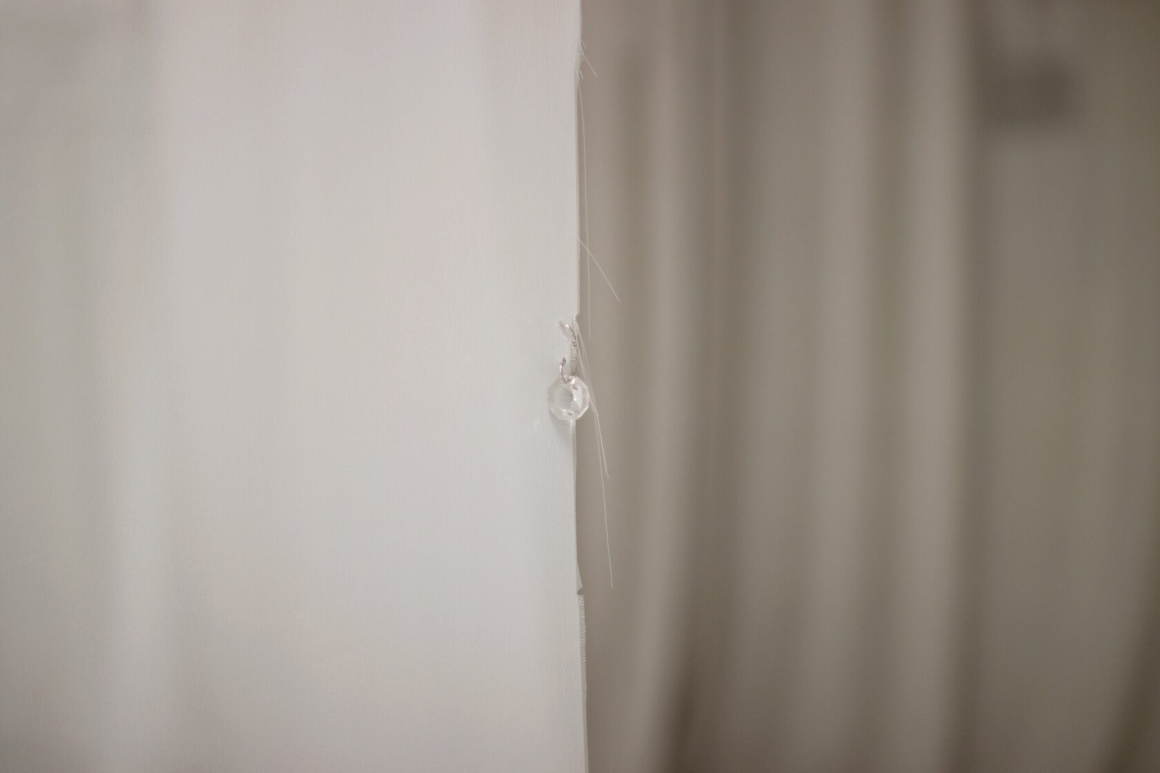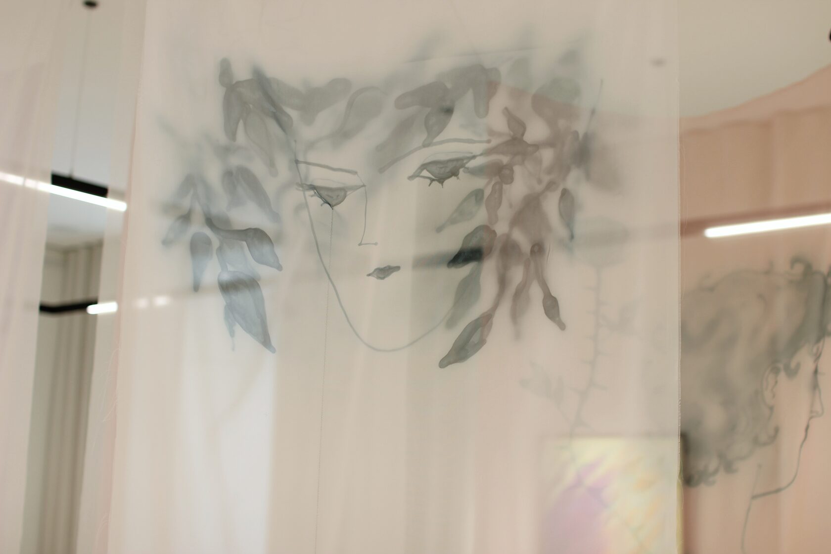 Such a Waste, Your Beautiful Face, 2023, сhiffon, ink, bead, 66х307 cm (details)