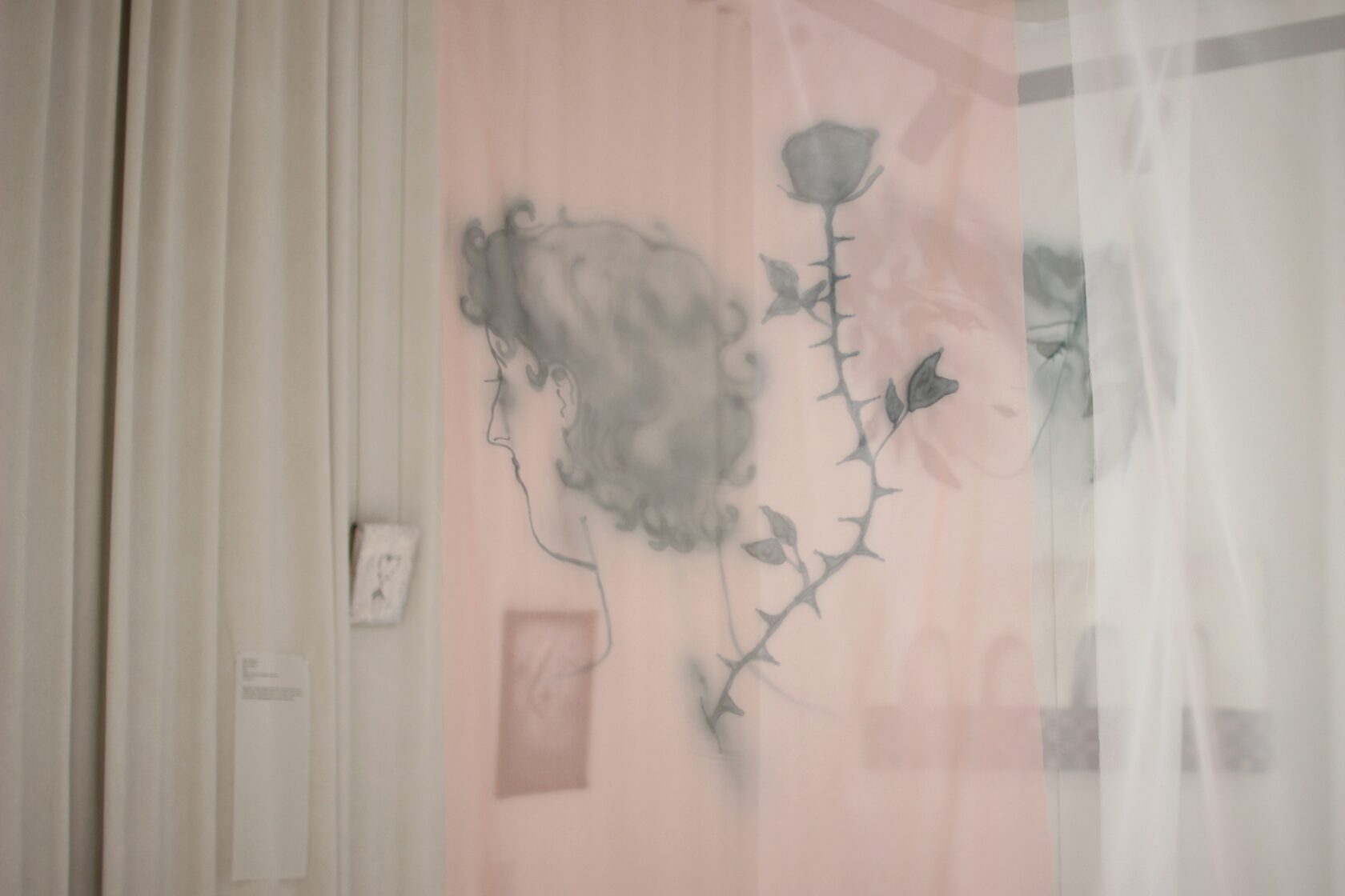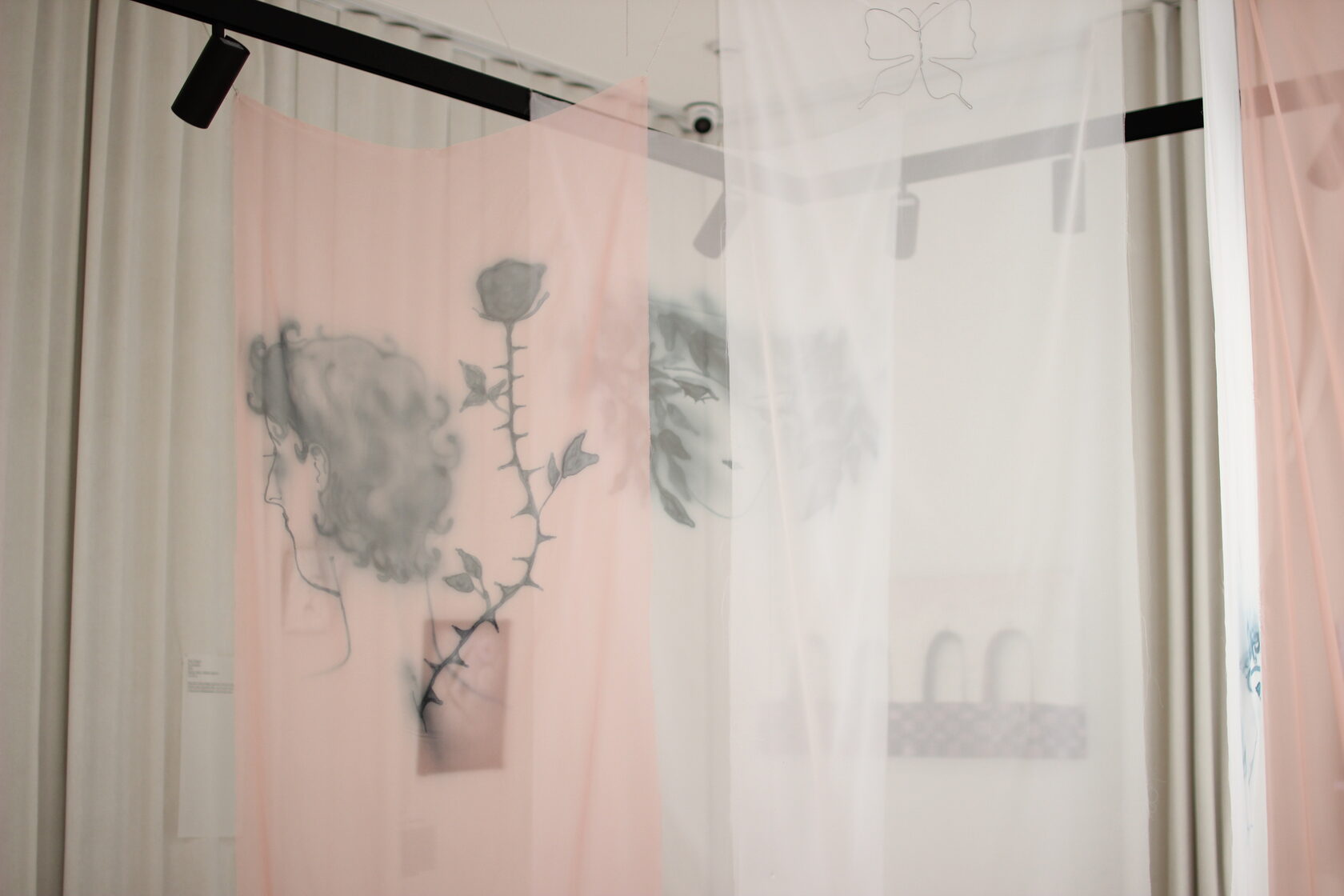Inspired by the night and its ability to conceal sharp corners in shadows and halftones, Nuriia focuses on observation and looks: the artist uses images of a butterfly, a young man, a girl, a rose with sharp thorns, and intertwined hands - all of which become metaphorical reflections of the complexity of human relationships and romantic feelings.