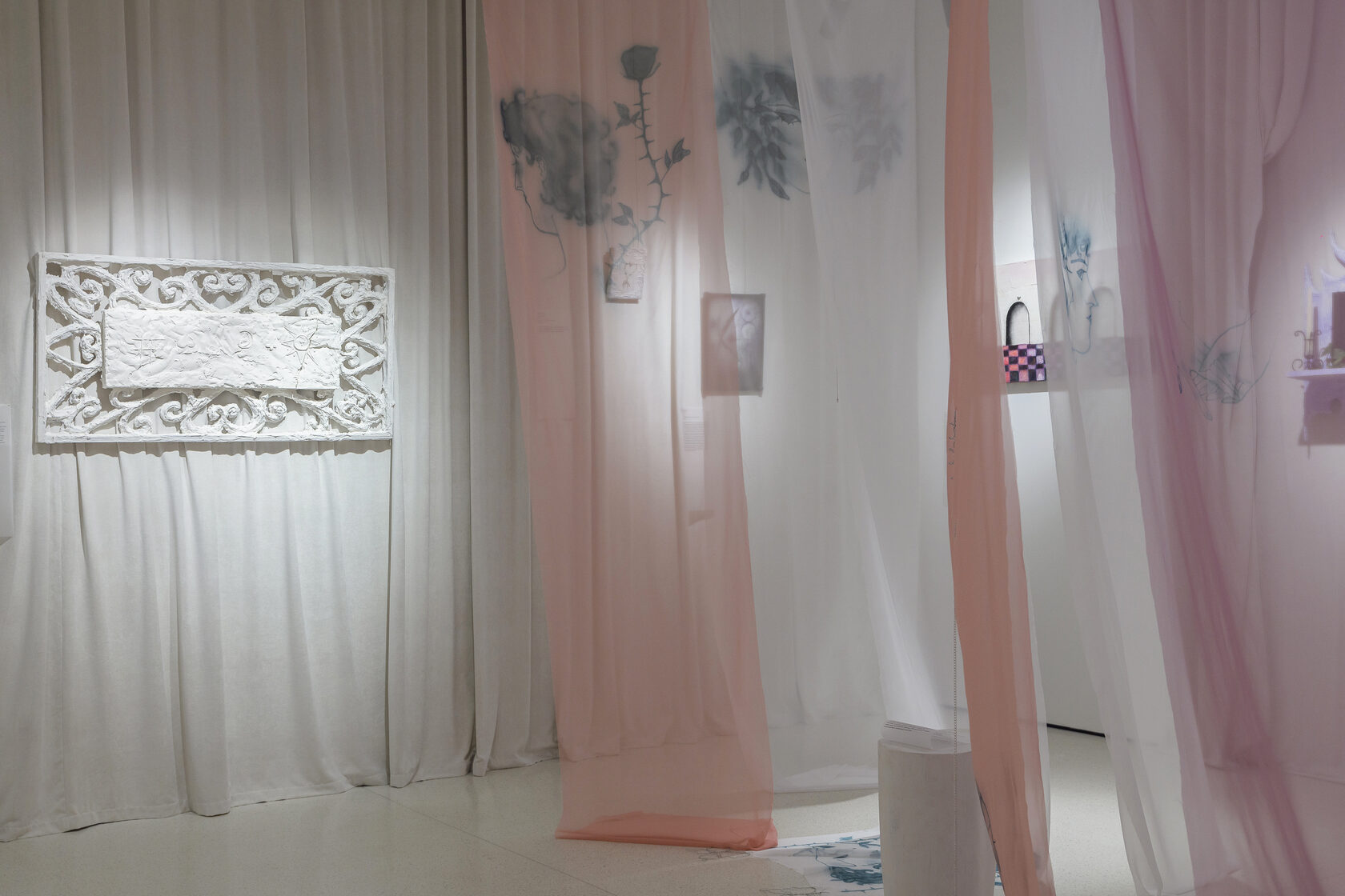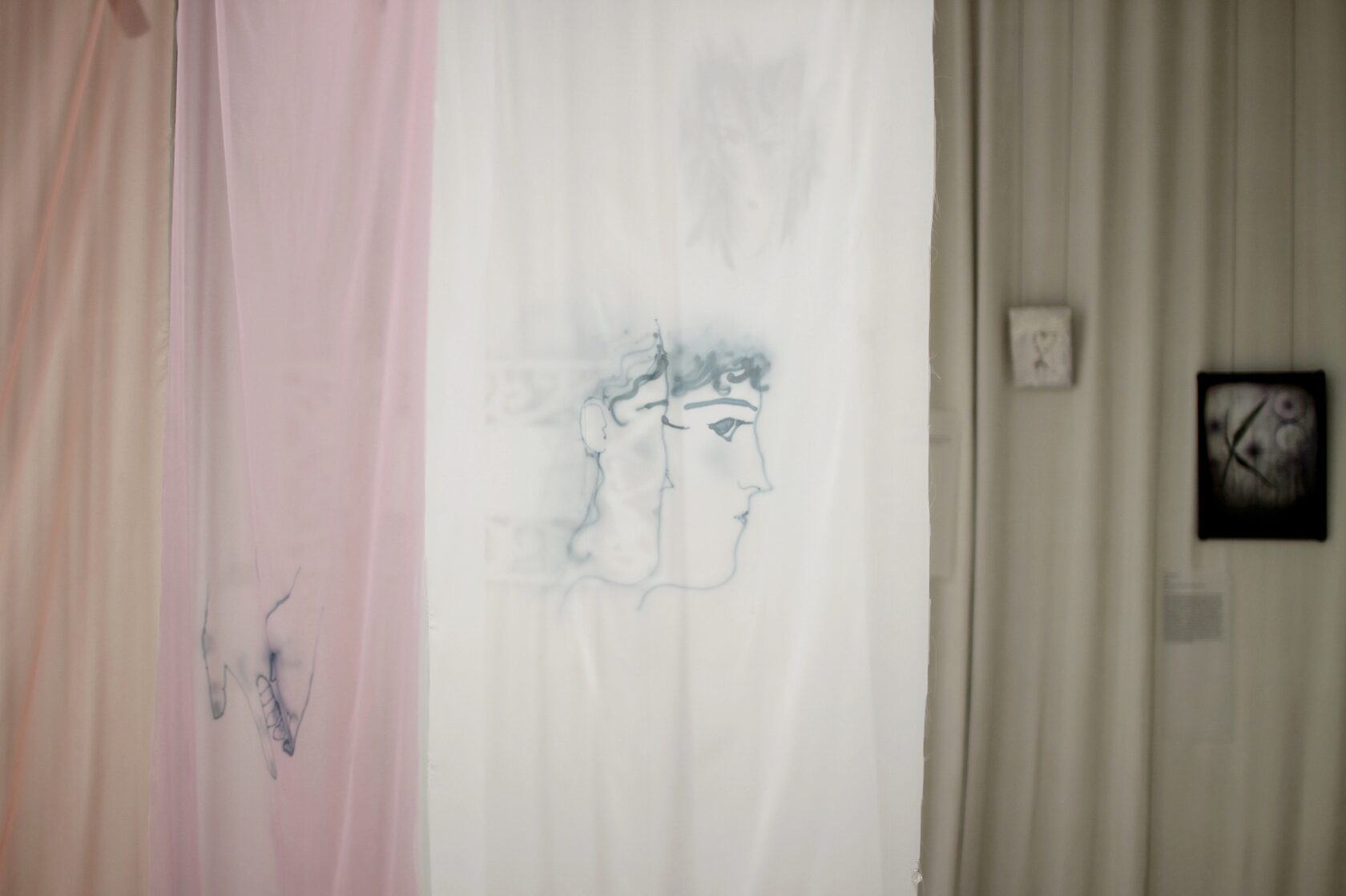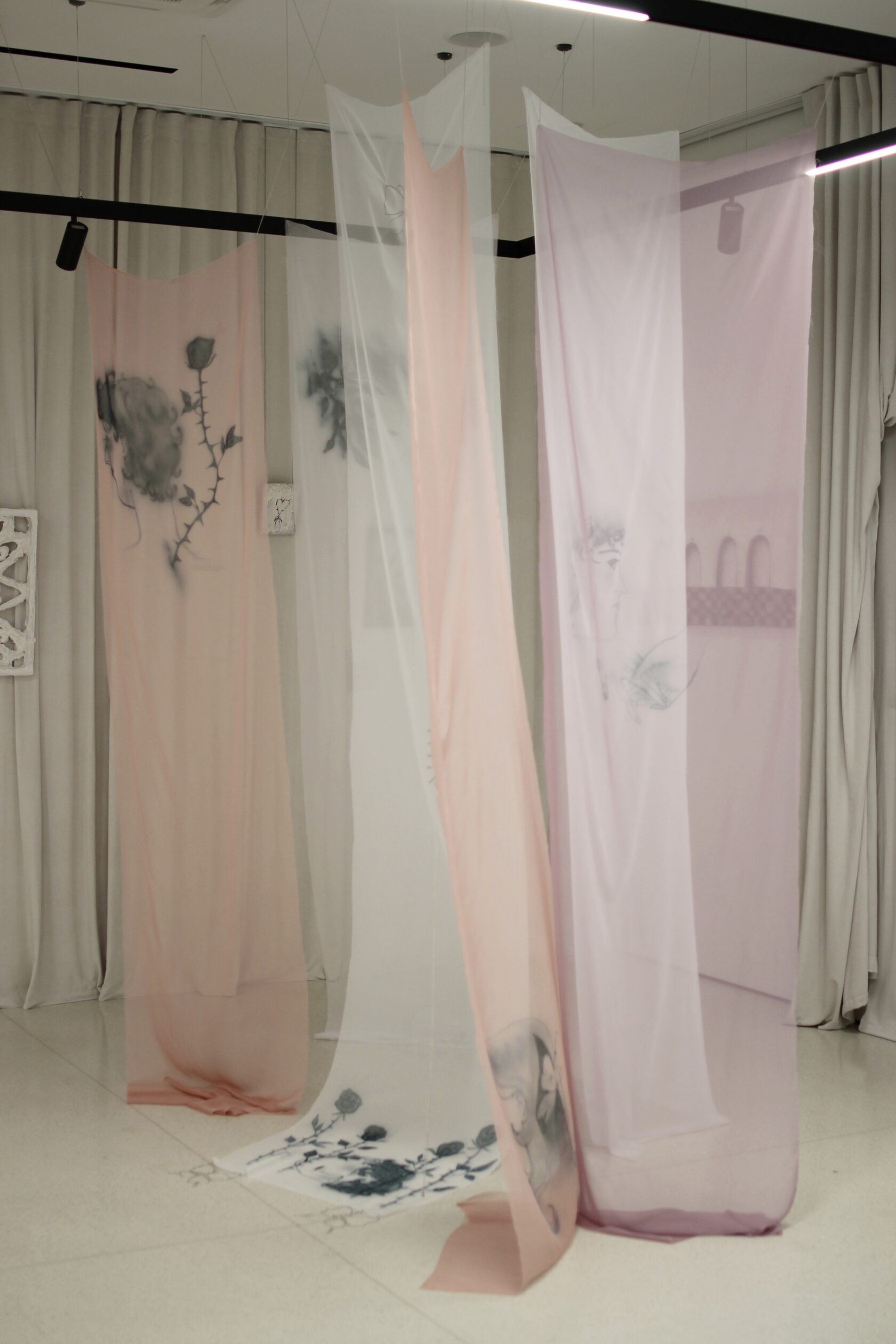 Canvases that create an installation by overlaying images on top of each other, like layers of sensations and experiences, showcasing depth in fabric work. This method helps Nuriia create a world of nocturnal half-shadows, blurred contours, and various hidden images, where each layer is like fallen leaves, establishing the narrative and perspective of a leisurely story.