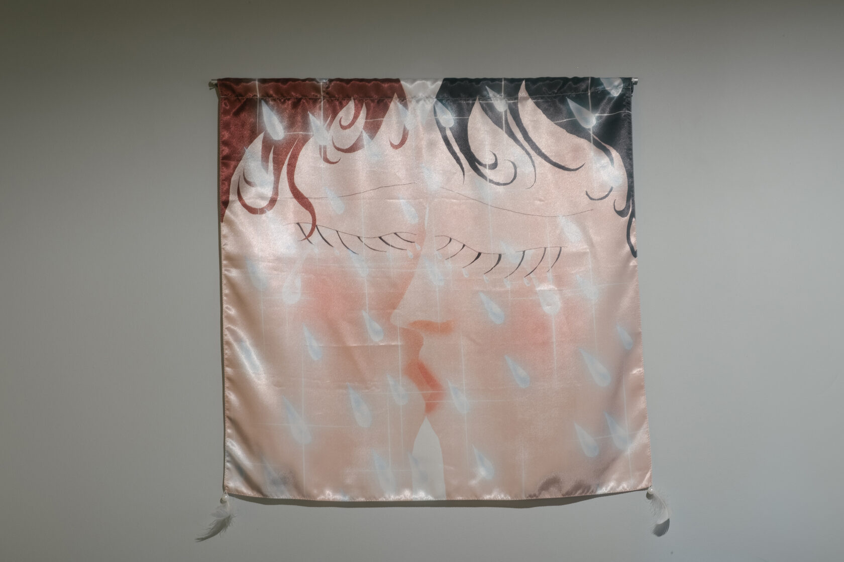 '15 Kisses', 2023, printed charmeuse, beads, feathers, 60x60 cm