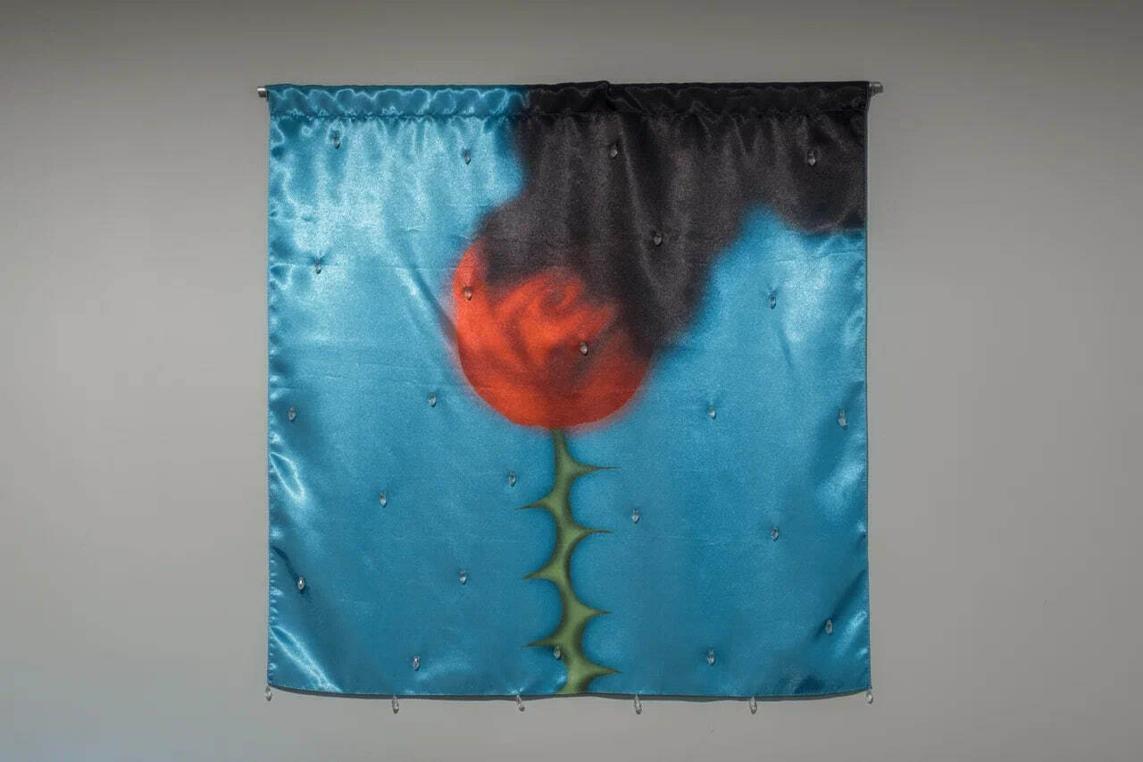 Untitled, 2023, printed charmeuse, beads, 60x60 cm